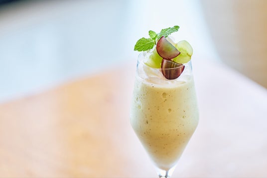 「マスカット&キウイシェイク」は甘いマスカットシャーベットをベースにヨーグルトを混ぜ、酸味のあるキウイをアクセントに組み合わせました。「シャインマスカットフロート」は透明のトニックウォーターと緑色のマスカットのシロップのグラデーションが美しい一杯です。どちらも旬のシャインマスカットをトッピングしています。