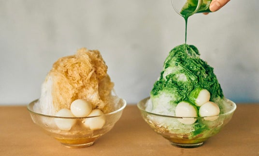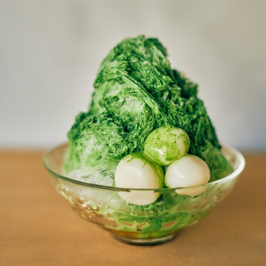 「かき氷 抹茶」は、京都嵐山の日本茶スタンド「八十八良葉舎」のブレンド抹茶と2種類のお砂糖を使用したかき氷。底に自家製抹茶アイスとコクがある甘さの“波照間産黒糖”を忍ばせました。最後に抹茶と“阿波和三盆”を濃厚なミルクで練った抹茶蜜で仕上げます。