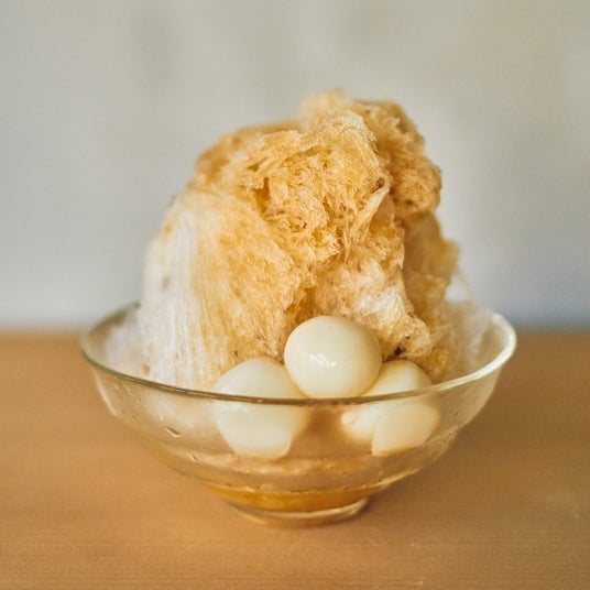 「かき氷 みぞれ」は、徳島県産の上質な“阿波和三盆”を贅沢に使用した、お砂糖を愉しむかき氷。かき氷の底に自家製のミルクアイスとパッションフルーツを沈めています。“阿波和三盆”のみぞれをかけてお召し上がりください。