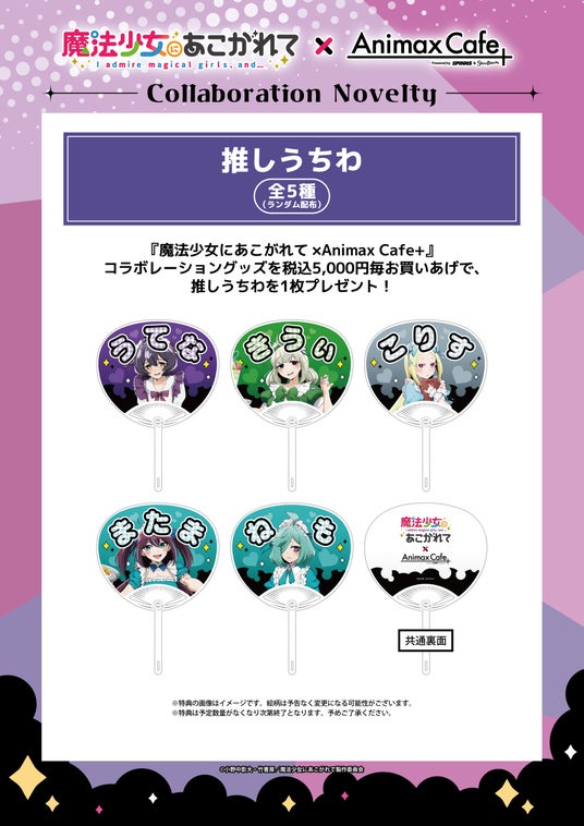 ・魔法少女にあこがれて×Animax Cafe+のコラボレーショングッズを税込5,000円毎お買い上げで、推しうちわを1枚プレゼント!