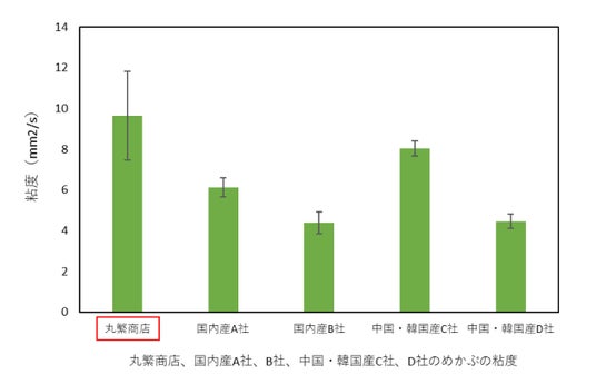 めかぶのネバネバ感を表す粘度は、自社独自製法で製造した気仙沼産めかぶ9.64mm2/sに対し、大手メーカーB社国産めかぶ4.39mm2/s、 大手メーカーD社中国・韓国産めかぶ4.46mm2/sであった。丸繁商店のめかぶは粘度がB社に比べ2.1倍、D社に比べ2.1倍高いことが判明した。