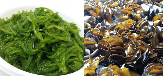 左:湯通しスライスめかぶ、右:湯通し前のめかぶ