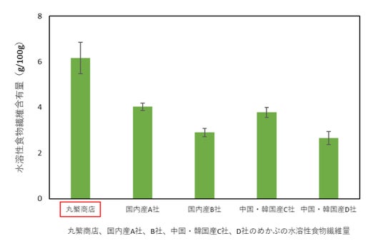 めかぶの栄養・機能性成分を表す水溶性食物繊維について、自社独自製法で製造した気仙沼産めかぶ6.16mg/100gに対し、大手メーカーB社国産めかぶ2.90g/100g、 大手メーカーD社中国、韓国産めかぶ2.66mg/100gであった。丸繁商店のめかぶは水溶性食物繊維がB社に比べ2.1倍、D社に比べ2.3倍多いことが判明した。