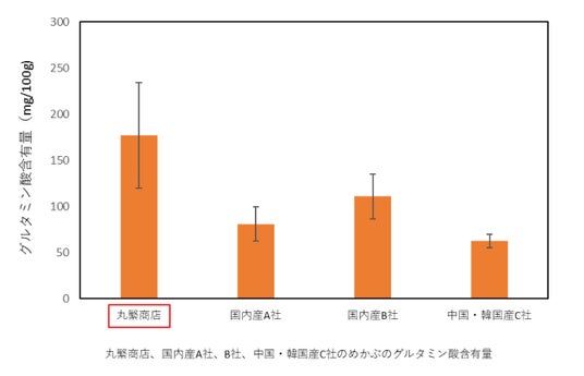 めかぶの旨味を表すグルタミン酸について、自社独自製法で製造した気仙沼産めかぶ176.98mg/100gに対し、大手メーカーA社国産めかぶ81.00mg/100g、 C社中国、韓国産めかぶ62.27mg/100gであった。丸繁商店のめかぶはグルタミン酸がA社に比べ2.1倍、C社に比べ2.8倍含まれていることが判明した。※D社めかぶは味付きのため対象外とする。