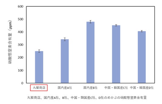 めかぶのえぐみ・雑味を表す硝酸態窒素について、自社独自製法で製造した気仙沼産めかぶ250.00ppmに対し、大手メーカーB社国産めかぶ480.00ppm、 C社中国・韓国産めかぶ453.33ppmであった。丸繁商店のめかぶは硝酸態窒素がB社に比べ0.5倍、C社に比べ0.6倍少ないことが判明した。