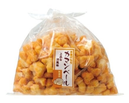 手揚げもちしょうゆ味、しお味、カマンベールチーズ味、塩わさび味、七味、食感のやわらかいソフトしお味、米生地にえびの旨みたっぷりのえび塩味。