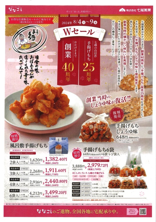おかげさまで「七越の手揚げもち」は、発売25周年を迎えます。それを記念し、昔ながらの旨みたっぷりのしょうゆを使った、創業当時の手揚げもちしょうゆ味を再現発売いたします。今まで食べていたおかきとはひと味違う、七越の自信作をぜひこの機会にご賞味ください。