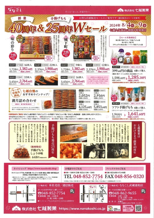 その他販売店については株式会社七越製菓本社(電話048-852-3753)にお問い合せください。
