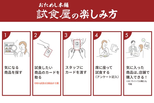 試食屋は、これまで知らなかった全国のメーカー(生産者)や商品の 「 発見」、試食を通じて商品の魅力を感じることのできる「体験」、商品の価値を最大限知ったうえで店舗やECで購入できる場を提供する、お客さまの食卓へ“ちょっといいもの ”をご提案する新たなプラットフォームとなります。 展示されている商品は全て試食可能、気に入った商品は“ほぼ全ての商品をその場で購入” も可能です。