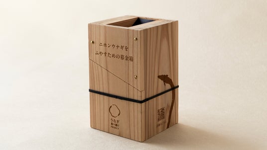 豊かな生態系の中で野生のウナギが増え、子どもたちがウナギを獲り楽しめる未来を願って、野生のウナギが多く居た頃から使われてきたこの箱筒の仕掛けをモチーフにしました。