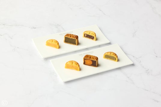 ミニ月餅(ティー セレクション)手摘みで作られた鳳凰単叢烏龍茶とジャスミン茶の風味のミニ月餅は、ペニンシュラのティーコレクションの最高峰です。淹れたてのお茶の香りが月餅の風味と調和し、繊細な職人技に浸る逸品です。鳳凰単叢烏龍茶は、オレンジの花の柑橘の香りと余韻のある甘さの絶妙なバランスが特徴。ジャスミン茶の芳香は柔らかく奥深い花のブーケを醸し出します。