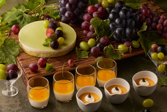 9月1日(日)より開催する『秋のプリフィックスランチ』では、秋の収穫祭「ぶどう狩り」をテーマに、さまざまな秋の味覚を心ゆくまで堪能できるデザートブッフェを提供します。メインとなる「ぶどう食べ放題」では、高級品種として名高いシャインマスカットや長野パープルなど、みずみずしい4種類のぶどうをお好きなだけお召し上がりいただけます。シェフサービスの「トリュフ風味のモンブラン」では、芳醇な香りのトリュフを織り交ぜた濃厚なマロンペーストを目の前で絞るパフォーマンスをご用意しています。視覚と味覚の両方でお楽しみください。その他「ぶどうと洋梨のケーキ」や「シャインマスカットムース」などのぶどうスイーツのほか、「スイートポテト」や「マロンカスタード」「かぼちゃプリン」など、芋・栗・南瓜をはじめとした秋の味覚をお楽しみいただけるデザートが勢揃いします。