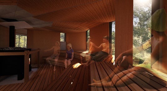 「木のサウナ」内観:様々な方向に開いた縦長の窓越しに森を感じることができる