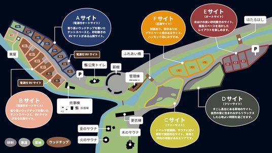 OND CAMPは、多様なキャンプスタイルに対応し、誰もが安心して自分らしいアウトドア体験を楽しめる場所です。家族や友人と自然の中で過ごす時間、川沿いの風景を楽しむ場所、一人での静かなリトリートなど、どんなシーンにもフィットするように6つのサイトを用意しました。また、車での乗り入れが可能なRVサイトや、テントを張る場所を自由に選べるフリーサイトなど、様々なニーズに応じたサイトが整っています。