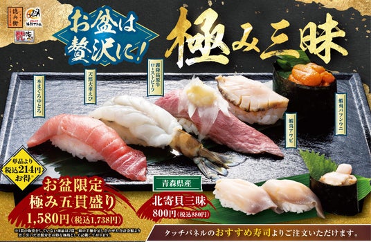 コロワイドグループの株式会社アトム(本社:神奈川県横浜市 代表取締役社長:田中公博)は、回転寿司業態の「にぎりの徳兵衛」「海鮮アトム」「海へ」の各店で、2024年8月9日(金)から「極み三昧」を期間限定で販売します。