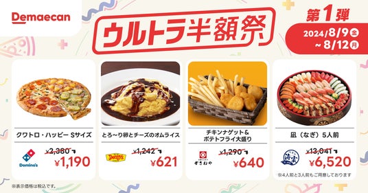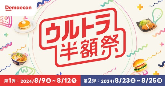 株式会社出前館は、運営する日本最大級のデリバリーサービス『出前館』において、対象商品が通常価格の50%OFFでご注文いただけるウルトラ半額祭を、第1弾は2024年8月9日(金)、第2弾は2024年8月23日(金)から開催いたします。