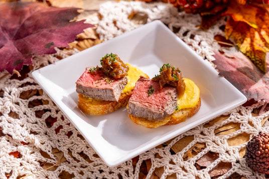 ローストビーフのブルスケッタ パンプキンとフェタチーズのクリームとキャラメルオニオンと共に