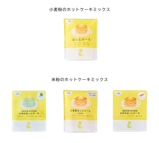 国産小麦粉を使用した本「ほっとけーち」に加え、国産米粉を使用した「お食事ほっとけーち ~米粉使用~」、また、本年発売した国産米粉に野菜粉末入りの「お米のほっとけーち こまつな入り」(4月発売)、「お米のほっとけーち にんじん入り」(7月発売)の4商品を展開しています。