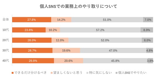 ・アルバイトの業務上のコミュニケーションを個人的なSNSで行うことについては、27.8%が「できるだけ分けるべき」、14.2%が「望ましくないと思う」と回答。4割以上が問題視していることがわかった