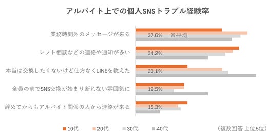 ・実際に経験したトラブルの中では個人SNSへの業務時間外のメッセージが最も多く、4割弱が経験。2位はシフト相談などの連絡や通知の多さとなった