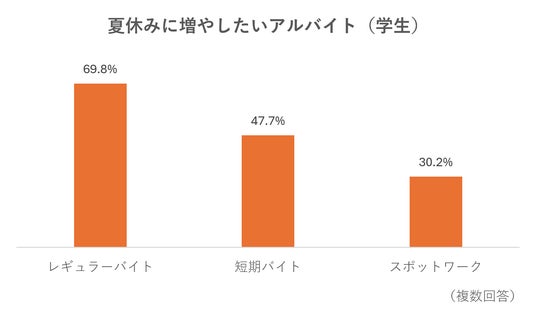 ・夏休みに増やしたいアルバイトはレギュラーバイトが69.8%、リゾートバイトなど短期バイト※4が47.7%、スポットワーク※5が30.2%だった