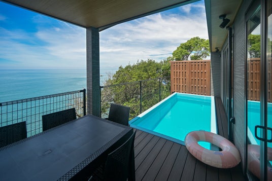 同じ敷地内にCLIFF VILLA EASTとWESTの2棟を2024年7月、同時オープン。コンセプトは「非日常空間でリトリート」。1棟につき1つずつサウナとプールの付いた完全プライベート空間で気兼ねなく家族や友人と過ごせます。