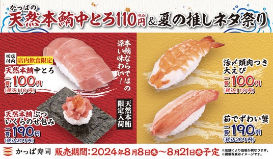 コロワイドグループのかっぱ寿司(カッパ・クリエイト(株) 本社:神奈川県横浜市、代表取締役社長:山角豪)は、2024年8月8日(木)~8月21日(水)の期間、『かっぱの天然本鮪中とろ110円(税込)&夏の推しネタ祭り』をかっぱ寿司全店にて開催いたします。