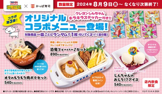 かっぱ寿司では、2024年7月18日(木)より『映画クレヨンしんちゃん オラたちの恐竜日記』とコラボレーションを開催しています。『映画クレヨンしんちゃん オラたちの恐竜日記』の公開日である8月9日(金)より、コラボレーション第3弾として、クレヨンしんちゃんキラキラステッカー(全6種)がランダムに1枚付く「オリジナルコラボメニュー(全3種)」を、かっぱ寿司全店にて販売いたします。