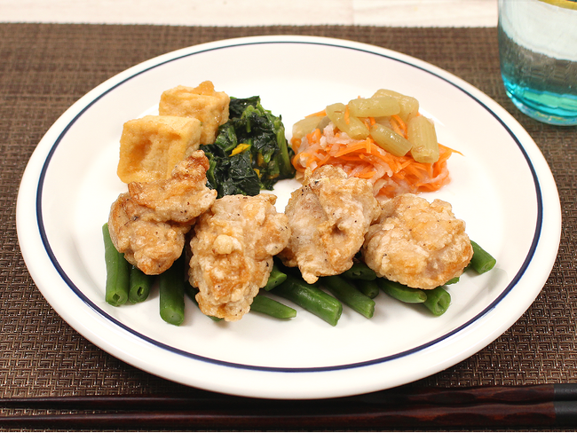人気のやみつき塩から揚げの味はそのままに、よりから揚げにマッチする副菜をご用意しました!あっさりしつつも旨みのあるから揚げと、和の優しい味わいの副菜でお箸がすすむプレートに仕上がっております。副菜は、ほうれん草のお浸しとみぞれ豆腐、ふきと切干大根のあえ物です。