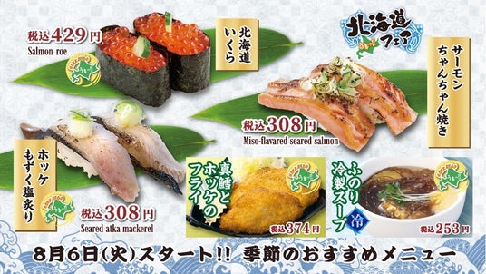 暑い夏を爽やかに楽しむため、北海道産の新鮮なネタや、北海道にちなんだ商品がラインナップされた今月の季節のおすすめメニューを、ぜひご賞味ください。