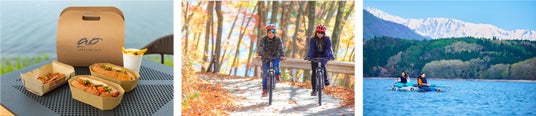 「ao LAKESIDE CAFE」では、近隣のライオンアドベンチャーやMauka outdoorと連携し、SUPやクリアカヤックなどの湖上アクティビティとランチ・カフェメニューをセットでお楽しみいただけるプランをご用意しています。また、大町市観光協会ともタイアップしサイクルスタンドやウォーターサーバーを設置。シェアサイクルのサイクルステーションとして、一周6.5km程度の青木湖周遊や、近隣に足を伸ばしての観光など、サイクリングを楽しむ方の利便性を高めています。アクティビティ体験後にもぜひ「Hakuba Zekkei Sauna “ao”」をお楽しみください。