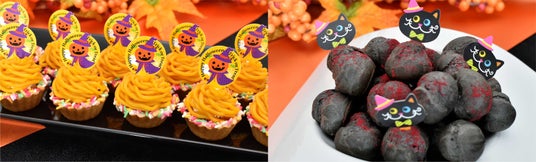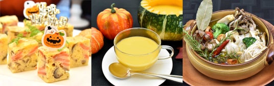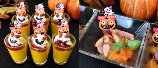 まるごとかぼちゃのスープ/秋野菜のパレット 感謝祭/かぼちゃとベーコンのキッシュ/黒糖パンとかぼちゃのサンド/茄子とズッキーニのグラタン/小海老とマッシュルームのアヒージョ/ブラッドカレー(レッドカレー)/グリルポークとラタトゥイユ/焼きたてステーキ/闇夜のコーラ竹炭ロールケーキ/ブラッドベリ―・レアチーズケーキ/魔法の竹炭プティシュークリーム/パンプキンモンブランタルト/闇の黒ごまチーズケーキ/オバケぎゅうひフルーツケーキ/ミイラマカロン/ハッピーカラフルチョコレートバナナ/パンケーキ/苺フィリング入りピンクドーナツ/キャラメルフィリング入りホワイトドーナツ/ソフトドリンク各種