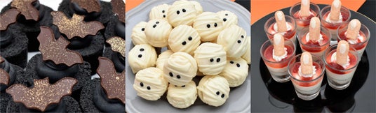 左から、闇夜のコーラ竹炭ロールケーキ、ミイラマカロン、ブラッドベリー・レアチーズケーキ