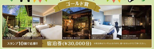 平山温泉(観光協会加盟店舗のみ)、ホテル日航熊本、阿蘇内牧温泉・湯巡追荘、ANAクラウンプラザホテル熊本ニュースカイ、日本画工房浮島館・別邸GUESTHOUSE のいずれかの施設で利用可能な宿泊券(3万円相当)