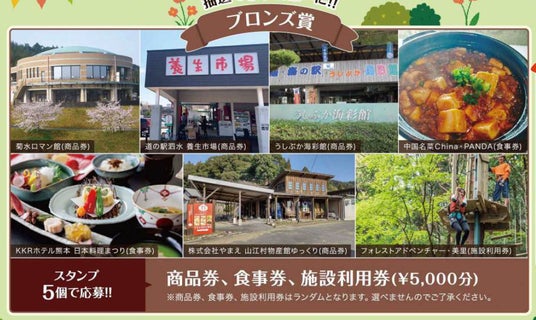 菊水ロマン館、道の駅泗水・養生広場、うしぶか海彩館、中国名菜China・PANDA、山江村物産館ゆっくり、KKRホテル熊本、日本料理まつり、フォレストアドベンチャー・美里 のいずれかの施設・店舗で利用可能な商品券・食事券・施設利用券(5千円相当)