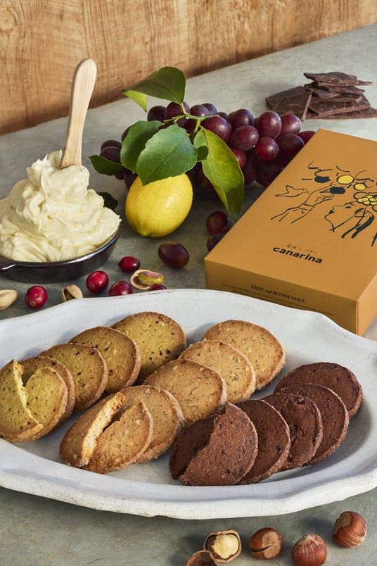 「果実とバター canarina」の人気商品『果実とバターのサブレ』は、ビターなレモンピールと香ばしいヘーゼルナッツに、芳醇なバターを合わせた『ヘーゼルナッツ シトロンバター』、ラム酒に漬け込んだレーズンと、香り高いココアパウダーを芳醇なバターが包み込み、まろやかに香ばしく仕上げた『ショコラ ラムレーズンバター』、真っ赤で甘酸っぱいクランベリーの実と、コクのあるピスタチオを芳醇なバターと合わせ、丁寧にさっくりと焼き上げた『ピスタチオ クランベリーバター』の3種を詰め合わせたこだわりの商品です。