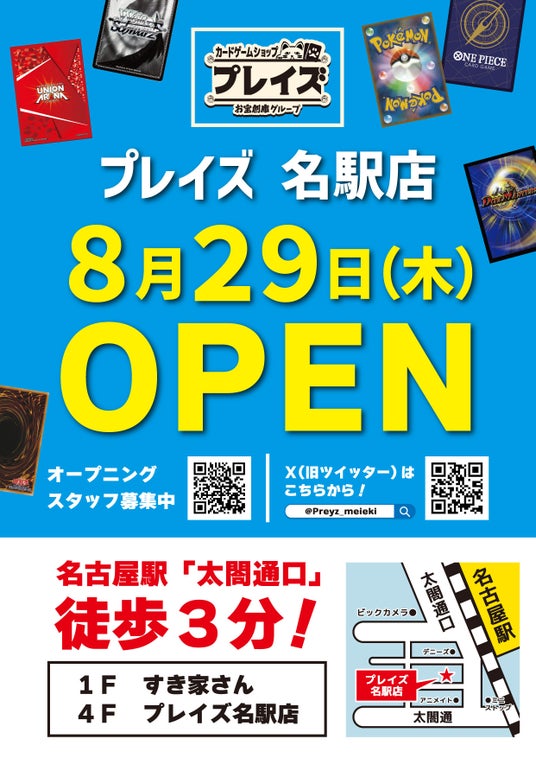 トレーディングカード販売・買取専門店「プレイズ」を運営する株式会社カジ・コーポレーション(エンターテイメント営業本部:愛知県半田市、代表取締役社長:前川 智範、以下、カジ・コーポレーション)は、名古屋市中村区に新店舗「プレイズ 名駅店」を8月29日(木)にオープンいたします。年齢や性別を問わず、すべての方が来店しやすい店舗を目指すべく、「ぎゅっと詰まったトレカ宝箱」をコンセプトに掲げ、当店にしかできないサービスを提供いたします。