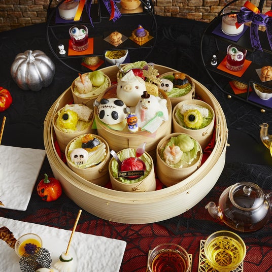 「桂花苑」の「チャイニーズハロウィンアフタヌーンティー」は、魔女のほうきに見立てた大根の酢漬けや、きゅうりとブルーベリーで目玉を表現した白身魚のすり身のテリーヌなど、前菜からハロウィンの怪しげな雰囲気を演出いたします。セイボリーは、目玉のモンスターに見立てた焼売、コウモリをあしらったカボチャの蒸し餃子、ガイコツをイメージした鮭と海老の蒸し餃子など、ハロウィンキャラクターが点心になって登場。大きなセイロの中心には、オバケに扮したぶたさんの肉饅頭や、フランケンシュタインに変身した人気のパンダ饅頭、求肥をかぶってオバケに仮装した蒸しカステラが愛らしくまぎれています。黒スタンドには、ジャック・オー・ランタンの生月餅やマンゴープリン、ブドウのゼリーなどハロウィンカラー満載のスイーツがラインナップ。可愛らしく仮装した桂花苑の点心やスイーツをぜひこの機会にご賞味ください。