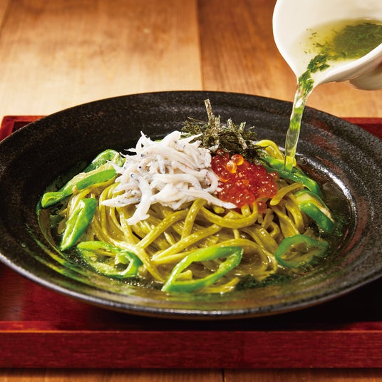 季節限定「駿河湾産しらすと万願寺とうがらしの和風~玉露の鯛出汁~」(1,540円 ミニサラダ付き)は、京都府産の碾茶(てんちゃ、抹茶の原料)を練りこんだ「京抹茶の生パスタ」に、玉露の茶葉入りの鯛出汁をかけてお召し上がりいただく新しいスタイルのパスタです。玉露のほろ苦い香りが、お口の中にふわっと広がります。