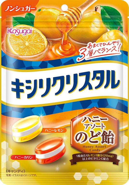 キシリクリスタル ハニーアソートのど飴ハニーレモン・ハニーカリン味の2種アソート。のどの乾燥が気になる秋冬にぴったり、はちみつを使った甘さとキシリトール層のひんやりがマッチしたノンシュガーのど飴です。ビタミンC配合。