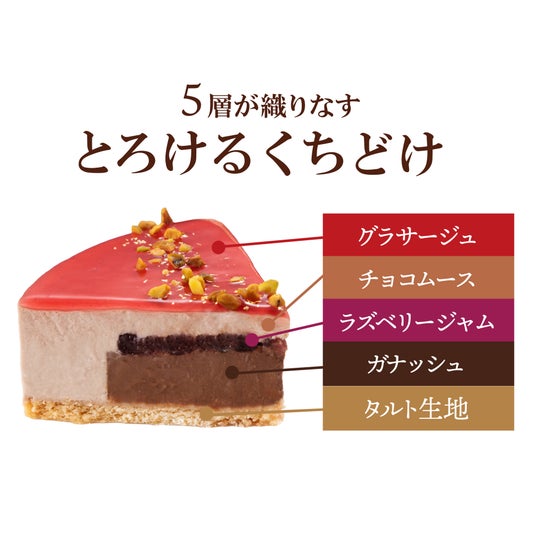 チョコレートムースに、八天堂のチョコレートクリームを使用した「ラズベリーショコラケーキ」です。
