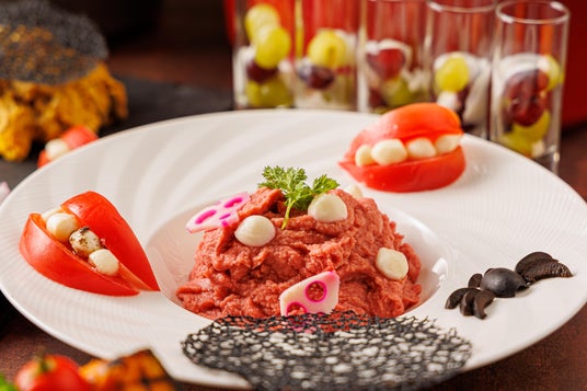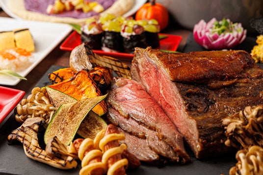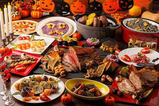 「ジャックオランタンの飾り寿司」や目玉ボールと指ソーセージを添えた竹炭風味の「黒いパスタ」、「唇カプレーゼ」などハロウィーン要素たっぷりの料理が並ぶほか、かぼちゃのサラダ、葡萄の軍艦寿司など秋の味覚を使用した料理が登場。オープンキッチンでお客様の目の前で切り分けて提供する「ローストビーフ」 は、西京味噌をベースにした和風ソースでご用意いたします。