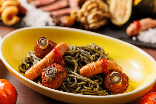 目玉ボール&指ソーセージの黒いパスタ