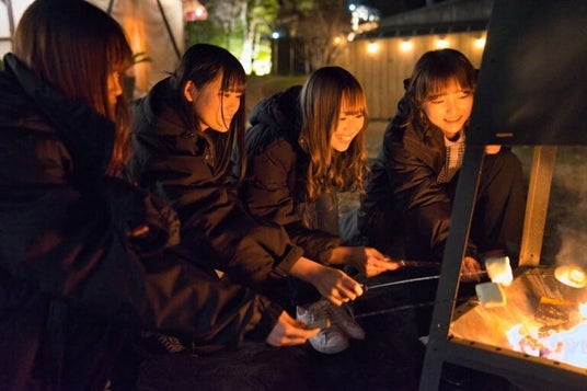 宿泊限定アクティビティーの焚き火を囲んで焼きマシュマロ!