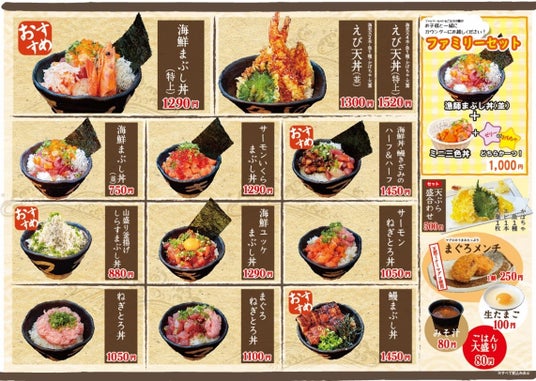 店頭ではどんぶりメニューの他にも、揚げたてサクサクの食感を楽しめる「天ぷら盛り合わせセット」、素材選びからこだわり製品開発をしてマグロの旨みを余すことなく生かした「まぐろメンチ」など、バラエティに富んだメニューを取り揃えております。お買い物の合間や、ご家族でお食事の際にぜひお立ち寄りいただき、当社自慢の新鮮な海の幸と多彩な料理の数々をご堪能ください。
