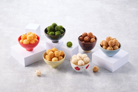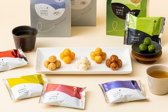 とよすの代表商品である『ひなあられ』をヒントにした、サクッとふんわり食感のお米のスナック。「comemari」のこだわりをより分かりやすく伝えるため、オープン当初からの定番である『明太子味』『コンソメ味』『お焦げ醤油味』『梅かつお味』の4種すべてのフレーバーの素材を改めて厳選し、それぞれの旨味やコクを引き立たせるために最適な産地の素材を使用いたしました。