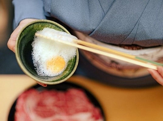 カウンターで味わうすき焼。メレンゲのような卵で食べるのが独特。工夫を凝らし目も舌も楽しませてくれる。