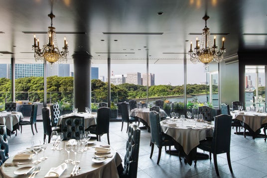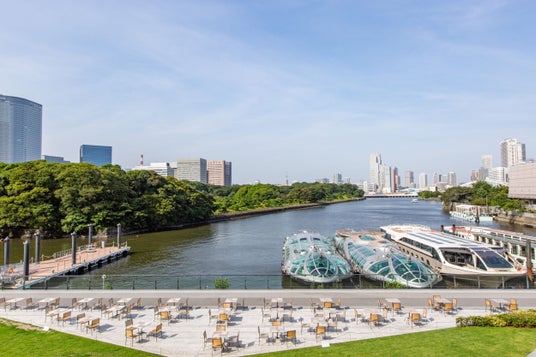 明るく解放的なテラス、目の前には東京湾の水辺と浜離宮の緑が広がり、スカイツリーが遠望出来ます。ここはまさに東京湾の最奥にひっそりと佇む入江のようです。