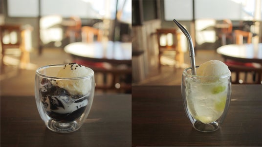 手作りの玄米珈琲ゼリーパフェとメロンクリームソーダ