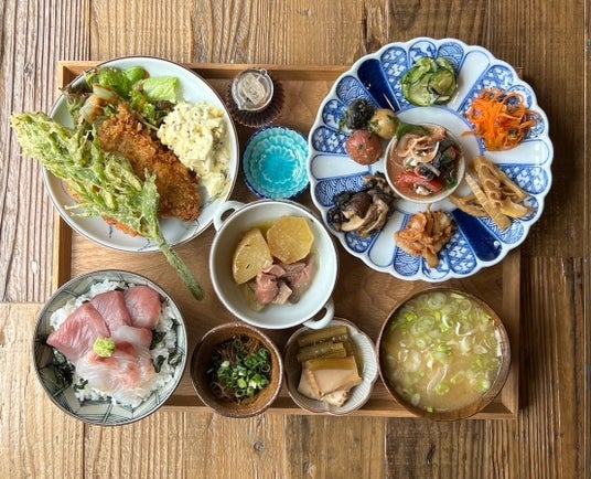 2021年5月、茅ヶ崎市を拠点にキッチンカーとして始まった "もったいない食堂 " 。2022年4月に、食材の宝庫である神奈川県三浦市に路面店をオープンをしましたが、「食べるだけで社会貢献できるレストラン」として人気を呼び、より多くの方に気兼ねなくお越しいただけるようにと、2024年8月1日に現店舗の2軒隣に完成する複合施設、「魚常荘」に移転拡大リニューアルオープン。2階には、一風変わった薬膳喫茶店「御自愛喫茶」を併設し同時オープンしました。